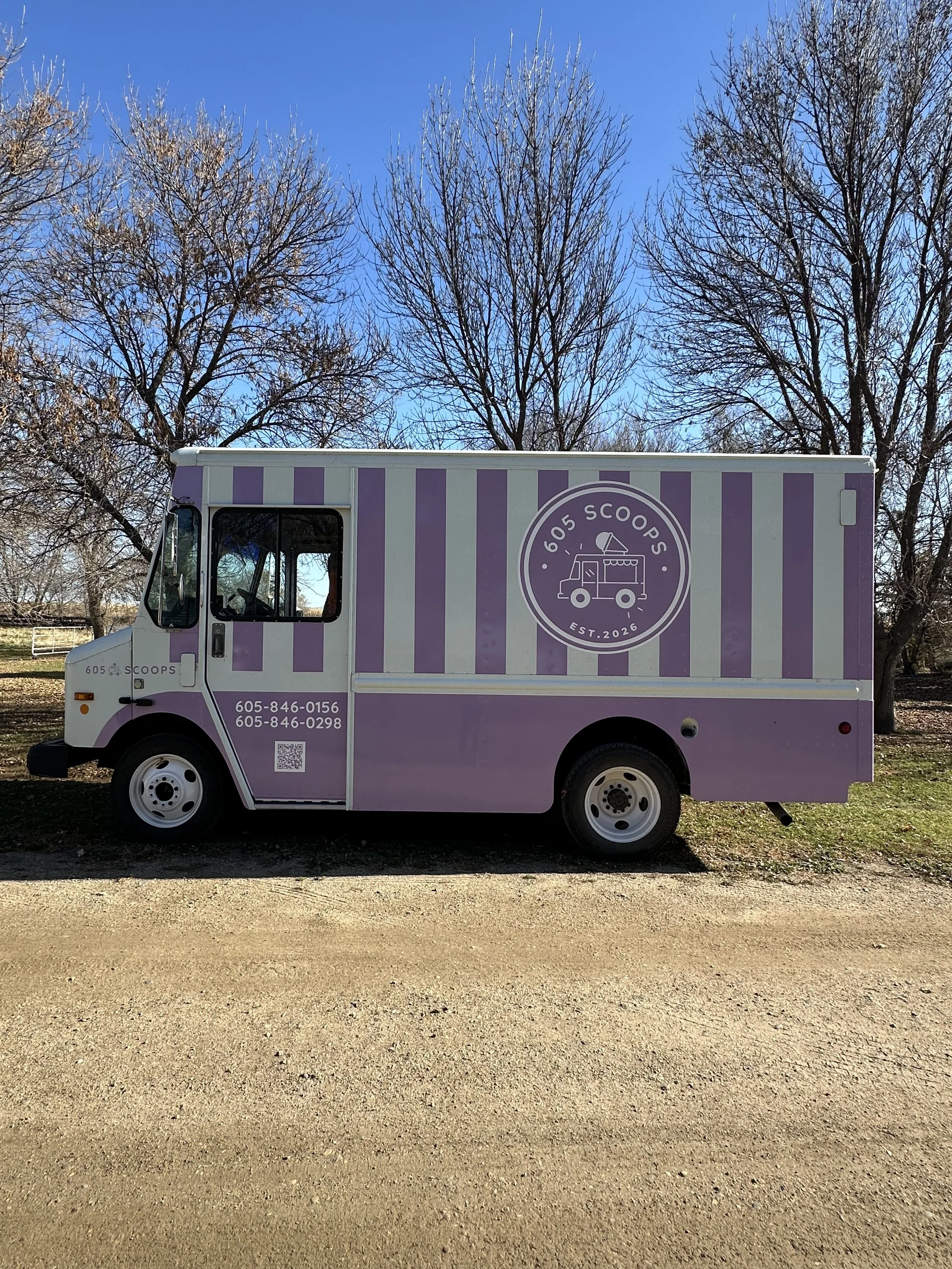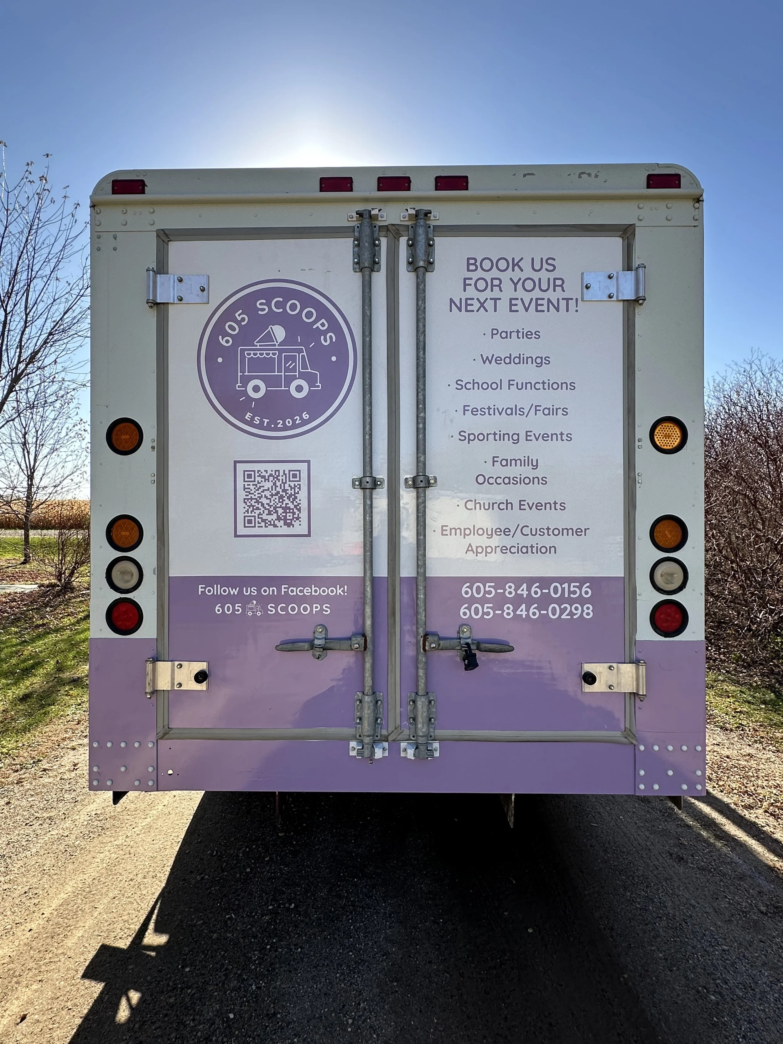 At first, she wasn’t sure if a truck was the way to go. She describes going back and forth between a trailer and a truck. Her daughter, Kayla, had already designed a truck as the logo for 605 Scoops, and before long, they came across a truck that matched the logo perfectly.